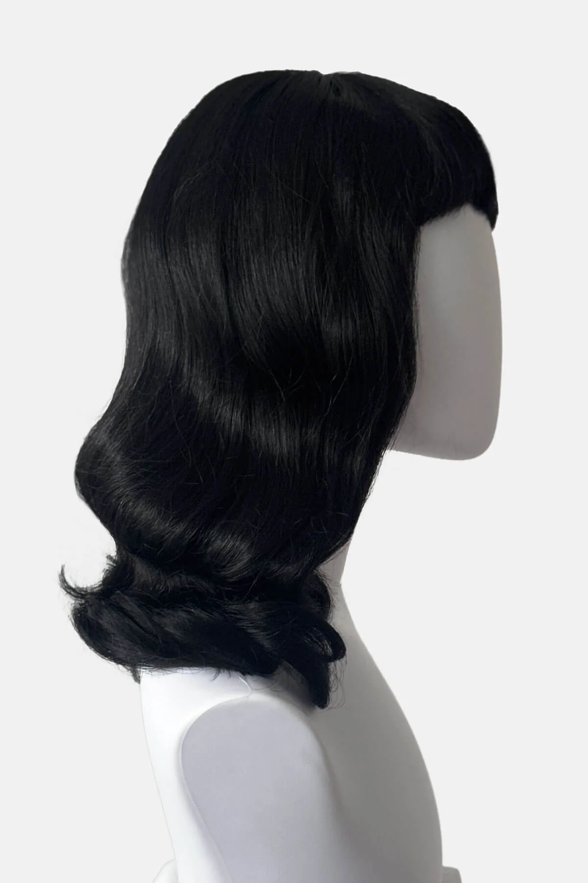 Step back into the fabulous 1950s with Bettie, our black pinup style wig featuring perfectly curled retro waves and a chic short fringe. Her blunt bangs frame your face with classic charm, making it effortless to channel that iconic pin-up look. Whether you're dressing up for a themed party or just want to add a touch of vintage glamour to your day, Bettie slips on easily to transform your style instantly. Embrace your inner pin-up goddess and turn heads wherever you go with this playful, timeless wig.