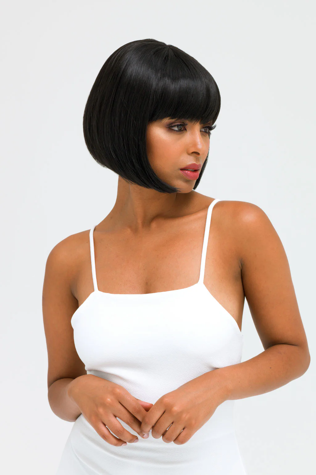 A gorgeous, modern take on the classic bob: with a flattering fringe; its blunt cut layers fall down to the chin and are gently curled inwards in a rounded shape which frames the face and gives a bounce to the movement.