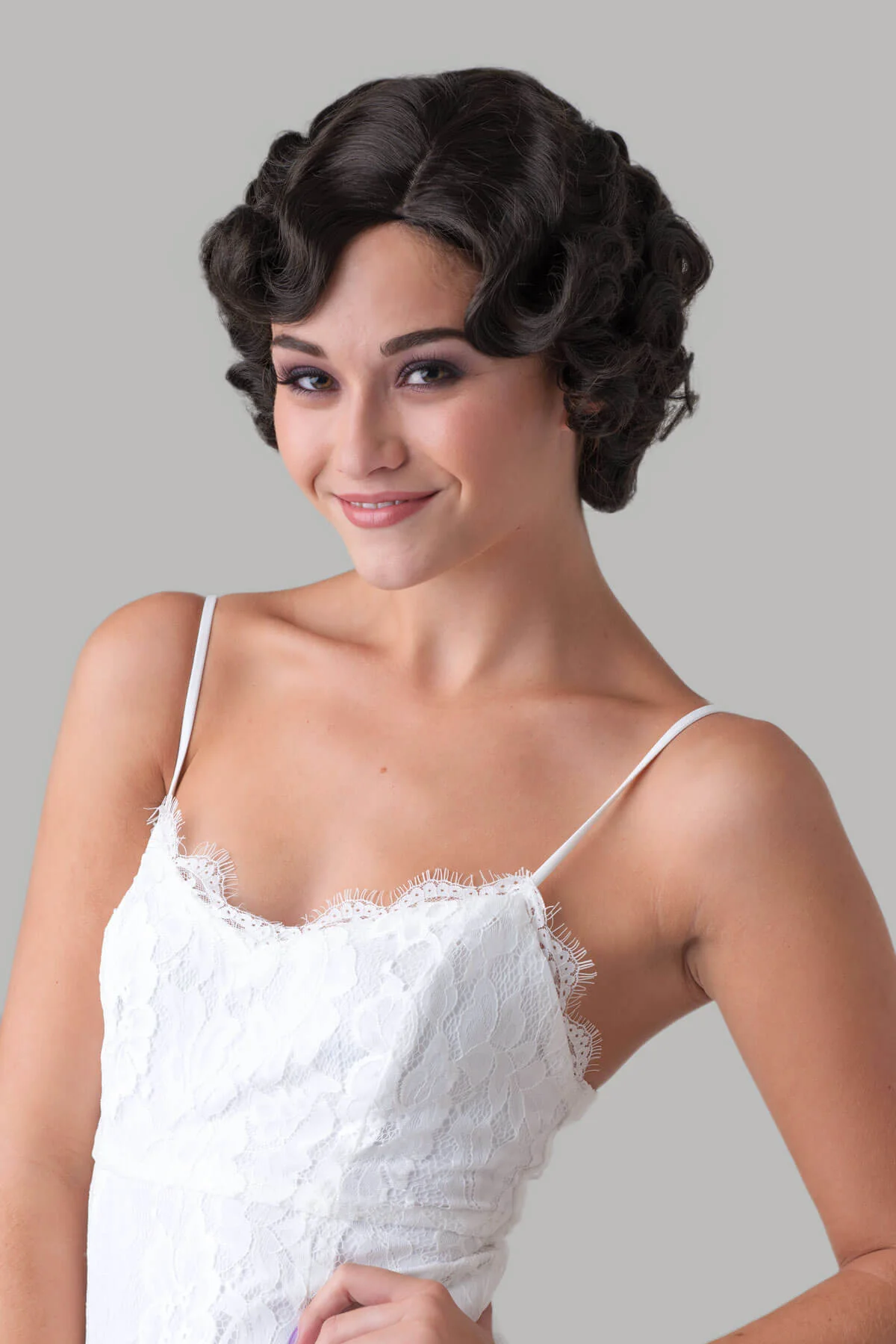 Inspired by the glamour of the 1920s, this rich brown wig features beautifully defined marcel waves set close to the head for a sleek, sculptural finish. The off-centre parting adds softness while preserving the clean, polished lines typical of true Jazz Age styling.
