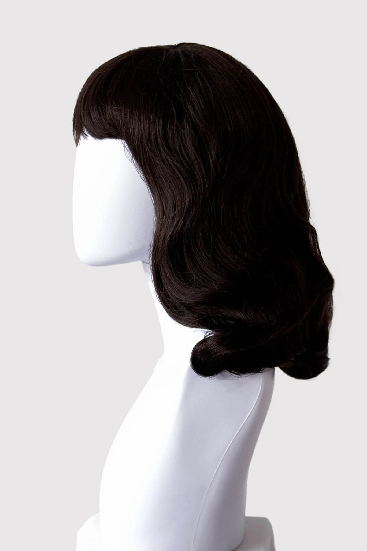 Dark brown pinup style wig, finger waved with short fringe, 1950s style: Becca