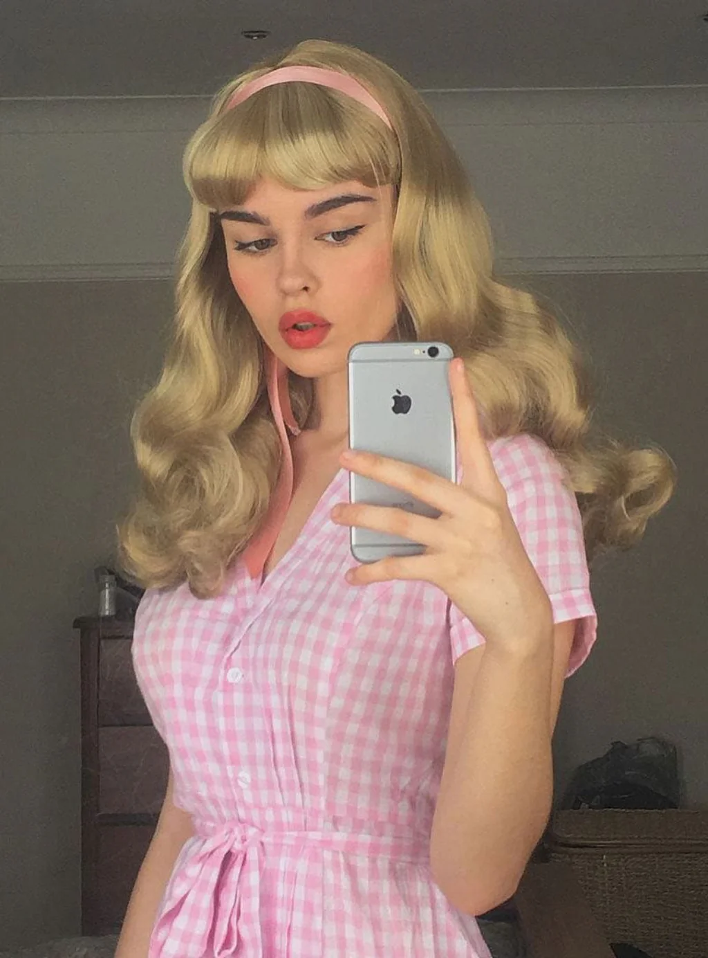 Emmeline is a stunning long blonde wig that captures the playful spirit of the 1950s Pin-Up era. Featuring gently wavy hair that flows gracefully past the shoulders, this wig combines classic charm with a modern twist. The short fringe adds a flirty touch, perfectly framing your face and enhancing your vintage look. Its beautiful two-tone blonde color adds depth and dimension, making every strand shine with personality. Whether you're stepping out for a retro party or simply want to add some nostalgic glamour to your style, Emmeline brings timeless elegance and fun to your everyday look.