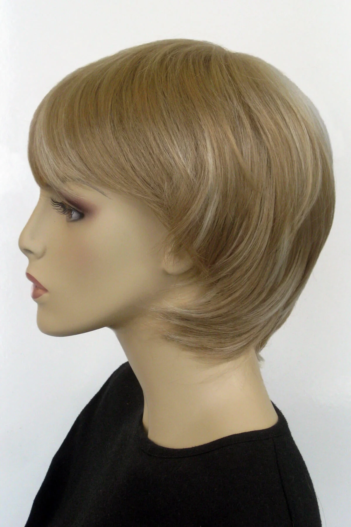 This elegant, two-tone blonde wig has all-over layers and a subtle fringe. The perfect 'pixie' style for all-day, everyday wear. The blonde is a mixture of ash-blonde with light blonde highlights.